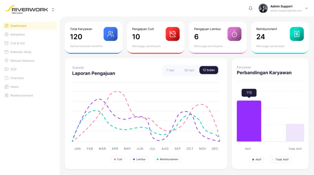 RiverWork adalah aplikasi HRIS (Human Resource Information System) modern yang membantu perusahaan mengelola karyawan, absensi, dan penggajian dalam satu sistem terintegrasi.
